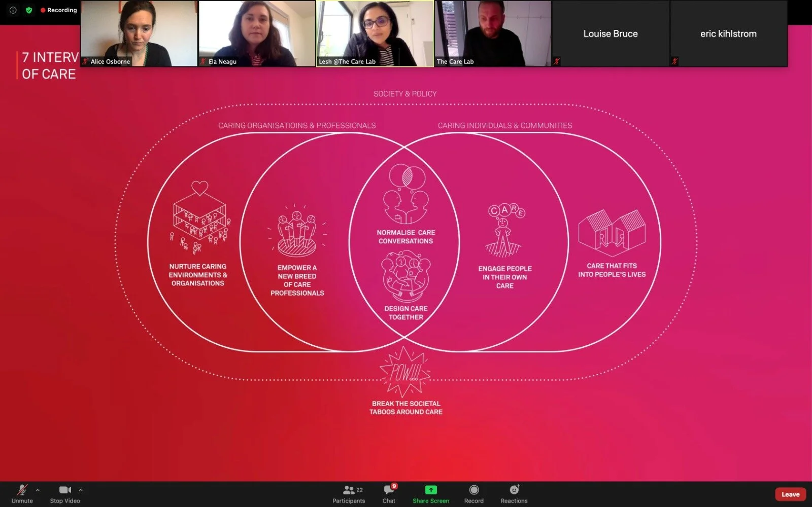 Our last session we were super happy to be welcoming the fabulous Hannah Bruce and Harriett Ackers from Dissideo, Lekshmy Parameswaran, László Herczeg from Care Lab. Care Lab shared with us their work around their Hospitable Hospice Project. If you want to learn more about the project specifically - you can read their inspiring report here where they radically re-imagined what it meant to be in a hospice.